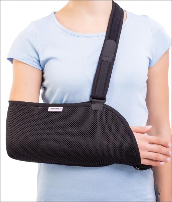 Orteză realizată din material textil, formată dintr-o singură componentă care susține brațul, prevăzută cu 2 benzi de susținere reglabile.